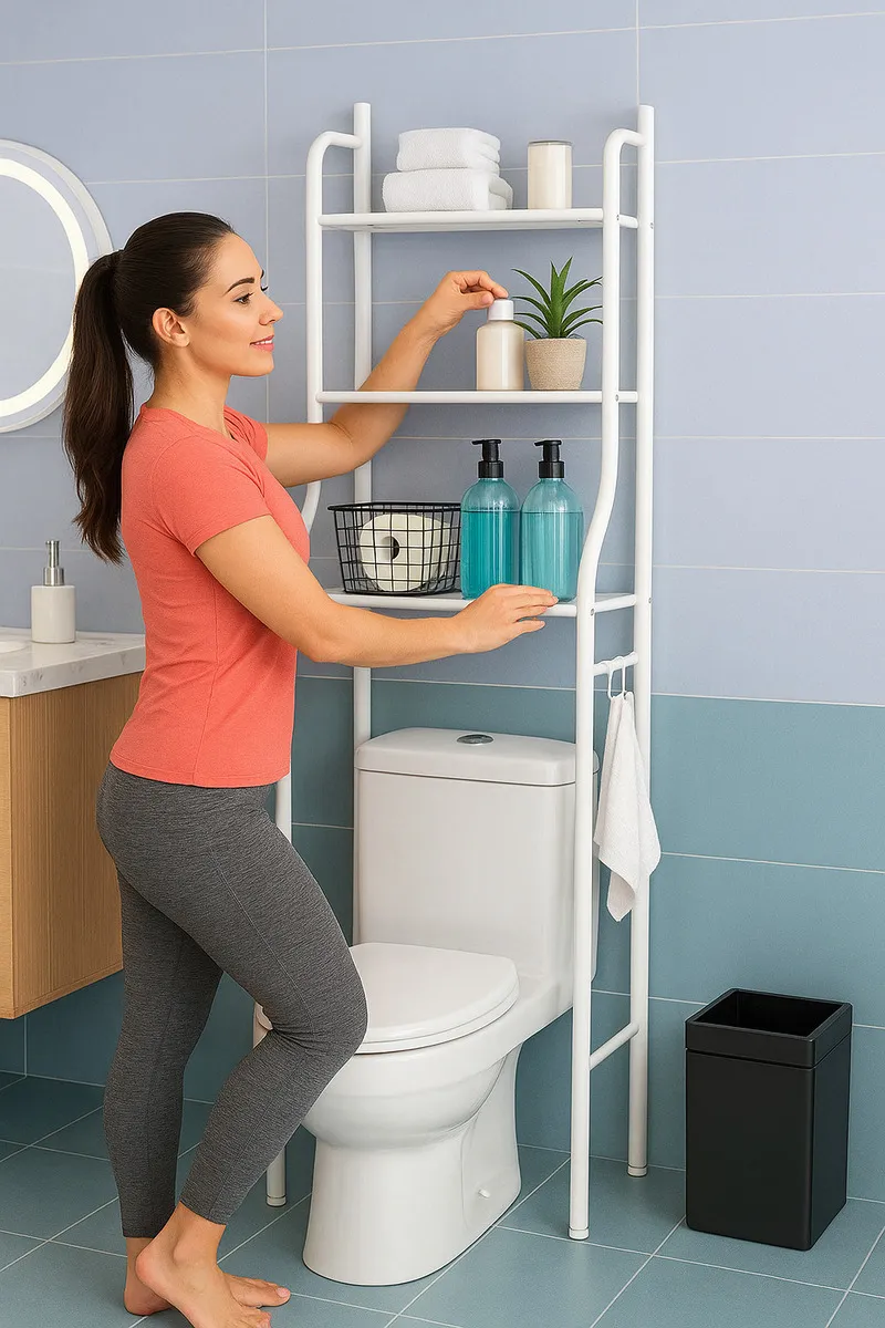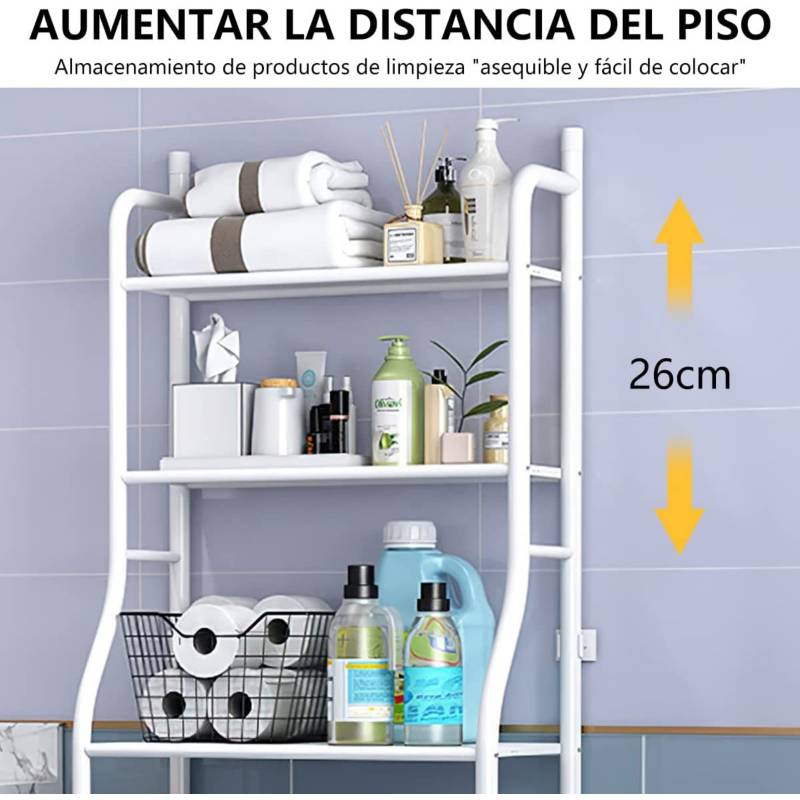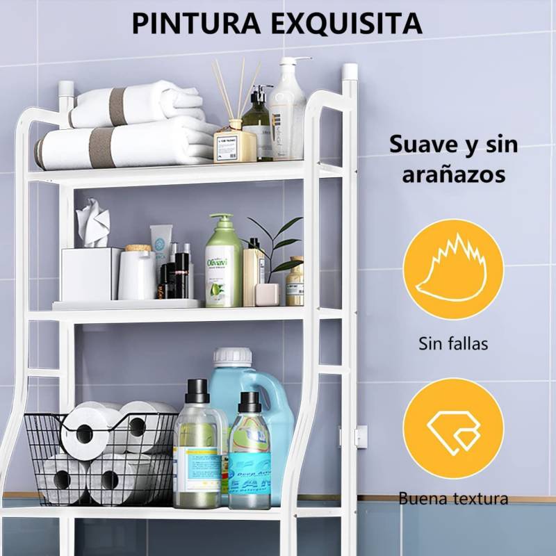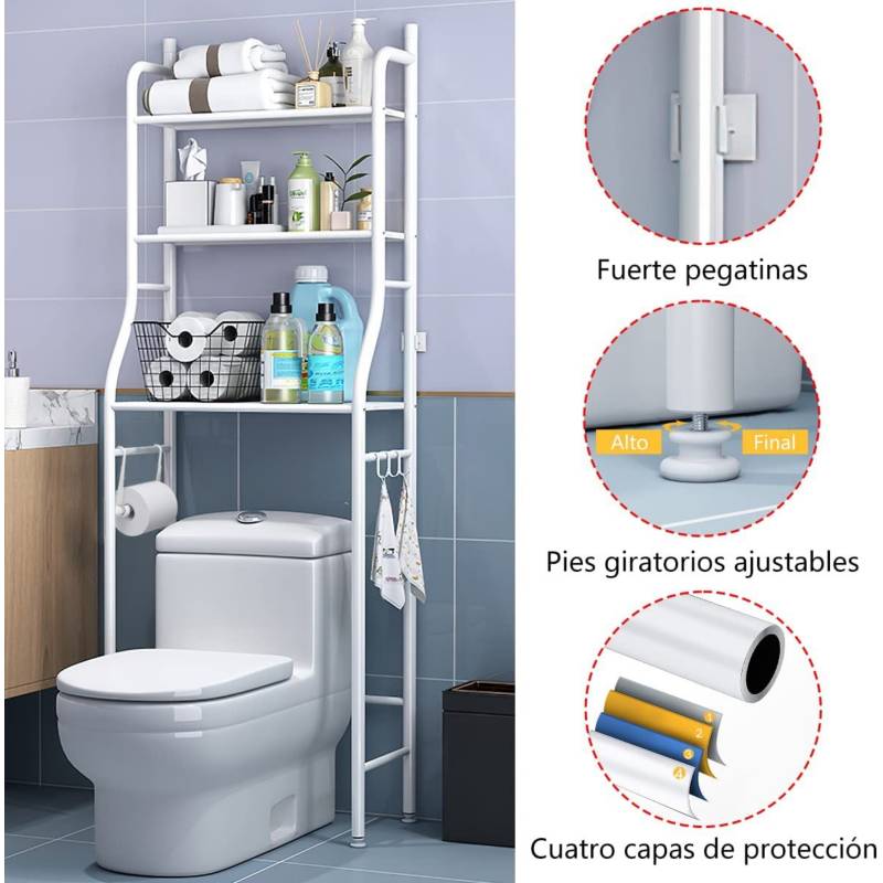 ¡Optimiza el espacio de tu baño al máximo! Este estante organizador está diseñado específicamente para aprovechar el área vertical sobre el inodoro o la lavadora, lugares que normalmente quedan desperdiciados. Su estructura metálica ligera pero resistente ofrece múltiples niveles de almacenamiento para toallas, artículos de aseo personal, papel higiénico y decoración. Cuenta con un acabado resistente a la humedad, ideal para el ambiente del cuarto de baño, y bases niveladoras para asegurar estabilidad incluso en suelos irregulares. Es la solución perfecta para mantener un baño ordenado y con todo al alcance de la mano sin necesidad de perforar las paredes.